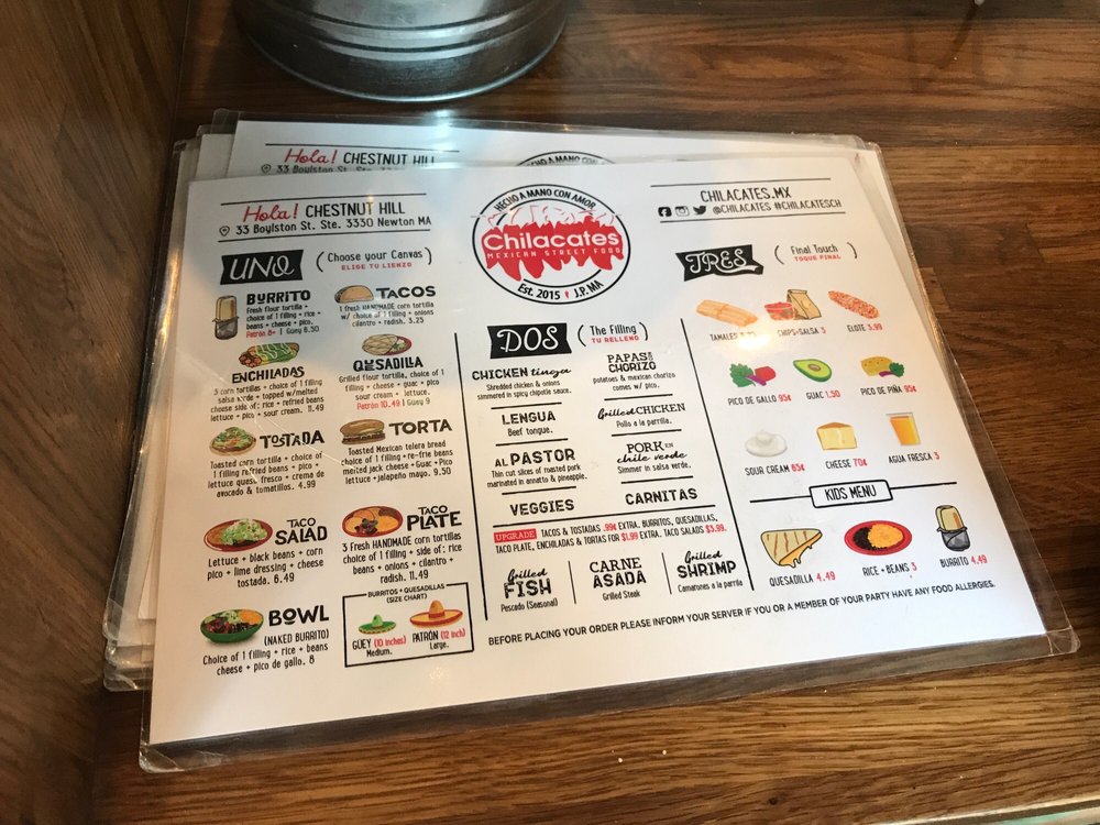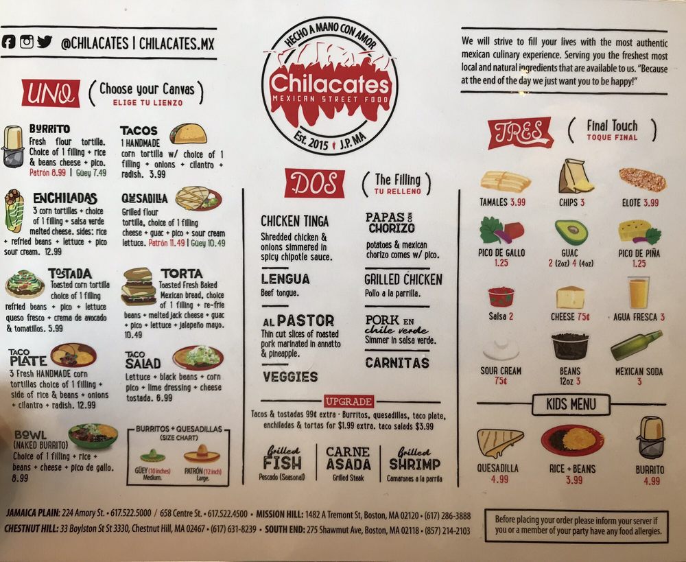 Chilacates Mexican Street Food located in Newton, MA offers a variety of Mexican dishes with a focus on fast food burritos and quesadillas. Customers praise the friendly ambiance, clean facilities, and generous portion sizes. The menu includes many vegetarian options and the outdoor seating provides a pleasant dining experience. Standout dishes like the Chicken tinga quesadilla have received high praise for their quality and flavor. With affordable prices and quick service, Chilacates Mexican Street Food is a go-to spot for satisfying Mexican cuisine in the Boston area.